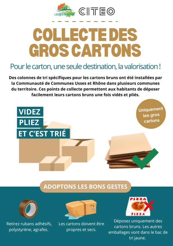 Important : ces conteneurs sont réservés uniquement aux cartons bruns. Les autres déchets (papiers, journaux, magazines, cartonnettes et briques alimentaires) doivent être déposés dans les colonnes jaunes du tri sélectif.